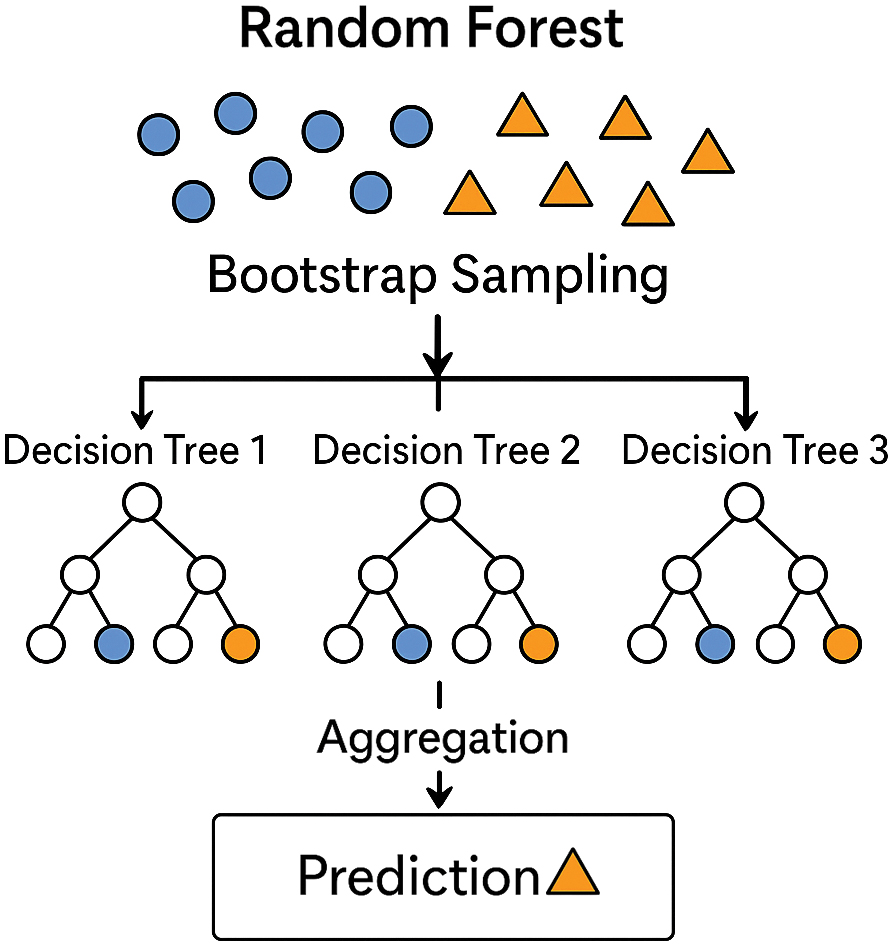 An RF is an ensemble learning method that builds a collection of decision trees and combines their predictions to improve accuracy and stability. It works by creating multiple random samples from the dataset through a process called bagging, where each sample is drawn with replacement and used to train an individual tree. To further diversify the trees, RF selects a random subset of features at each split, which reduces correlation among the trees. Once all the trees are built, their predictions are aggregated: for classification tasks, the model outputs the class chosen by the majority of trees. The RF model is shown in Fig. 8.