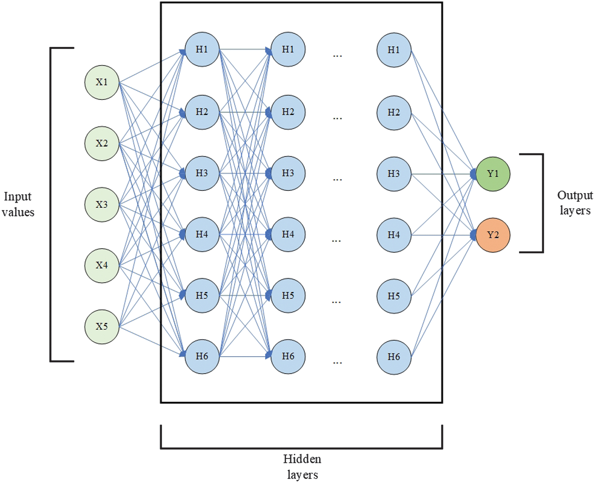 The structure of a DNN includes an input layer, which receives a fixed-size numerical vector. The input vector is followed by several hidden layers where weights are multiplied by neuron values and summed up with each other and a bias. The results of the multiplications then undergo Rectified Linear Unit (ReLU) or sigmoid activation functions. This computation is shown as (7):