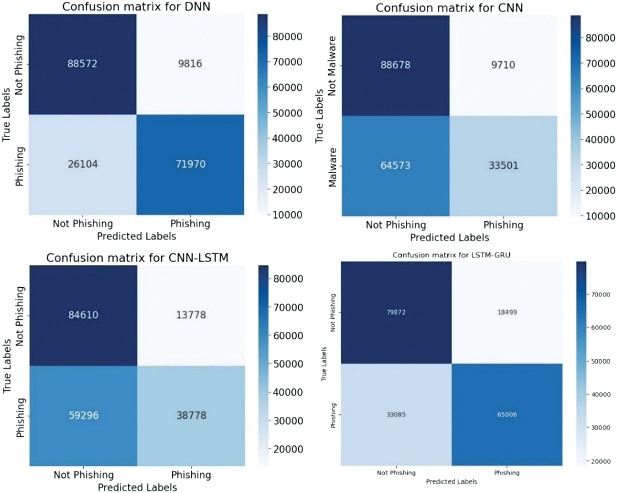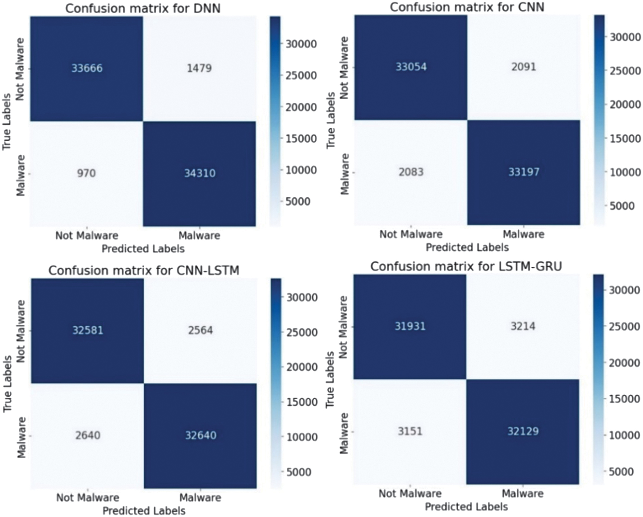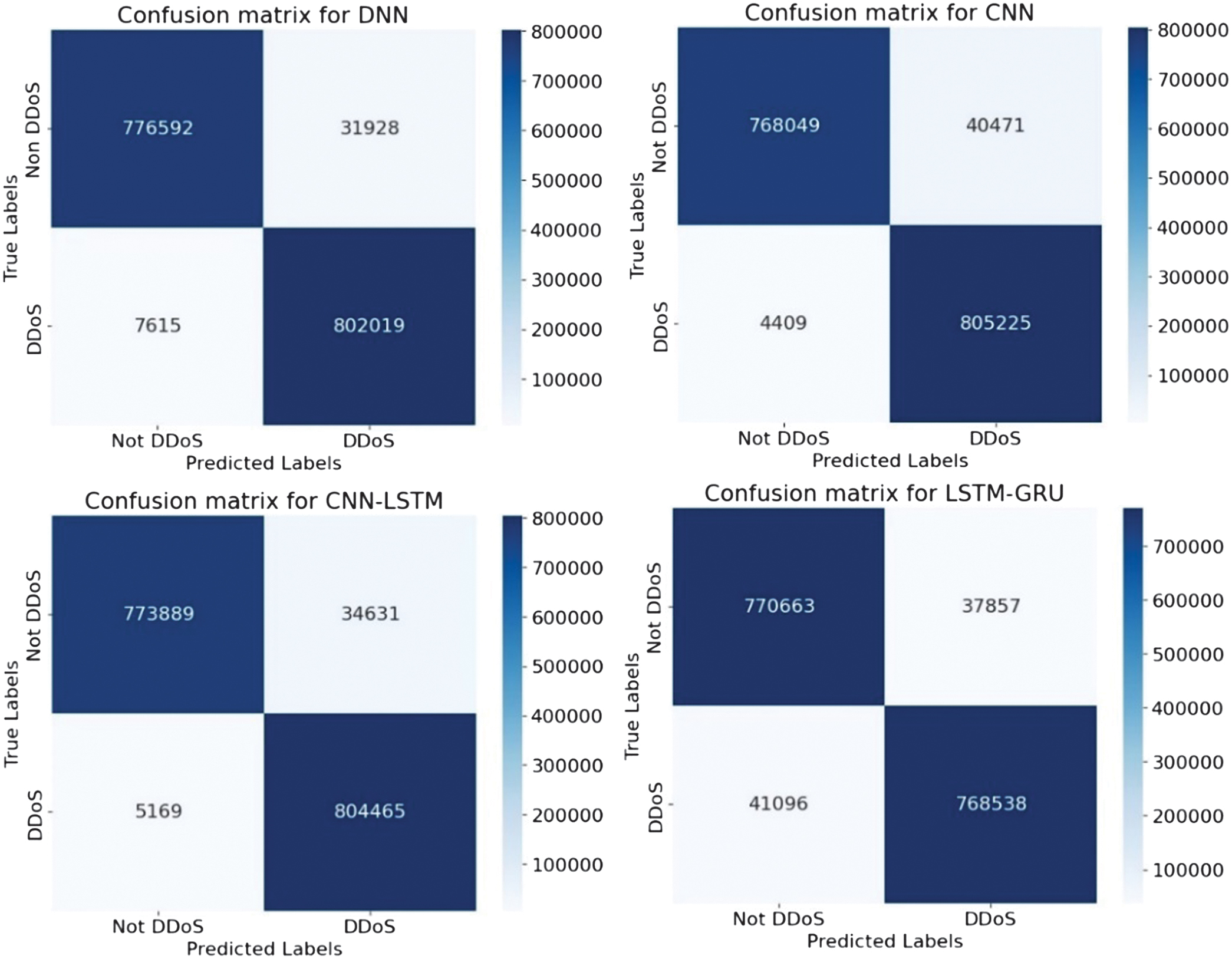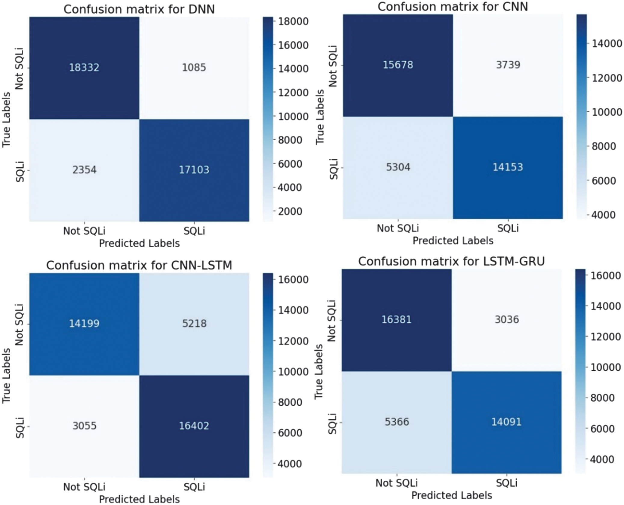 Experimental results on classifying cyber threats were conducted using four DL models: DNN, CNN, CNN-LSTM, and LSTM-GRU. Each architecture was trained and tested on labeled threat data to evaluate its effectiveness in identifying malicious activity. The models’ performance was estimated using accuracy, precision, recall, and F1-score classification metrics (12)–(15):