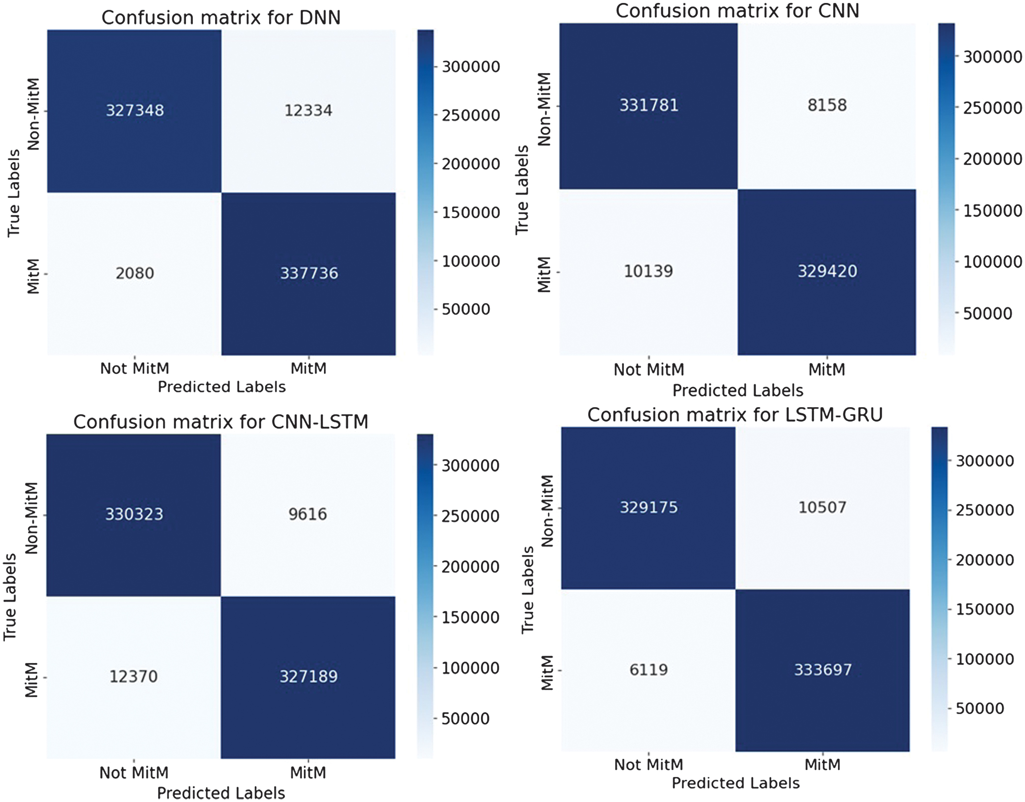 An experimental evaluation of the proposed DL models highlights both the strengths and limitations of each architecture in detecting various types of cyber threats. Across all datasets, DNN and CNN-LSTM demonstrate consistently high accuracy, particularly in classifying structured network threats, such as DDoS and MITM attacks. It suggests that the fully connected nature of DNN and the temporal–spatial processing capabilities of CNN-LSTM are well suited to modeling regular patterns in network traffic. For DDoS detection, all four models achieved accuracy above 95%, with DNN and CNN-LSTM achieving the highest F1-scores of 97.6%. It shows an ability to distinguish between legitimate and malicious traffic, which is essential for real-time defense mechanisms. Similar trends are observed in MitM classification, where the precision and recall metrics further validate the robustness of the models. Interestingly, LSTM-GRU showed competitive performance, reflecting the usefulness of combining memory-based architectures for consistent attack detection. For malware classification, performance dropped slightly, although DNN and CNN were still able to maintain precision and recall above 94%. The drop in overall precision suggests that malware features may be more diverse and more challenging to generalize, requiring deeper or more specialized networks.