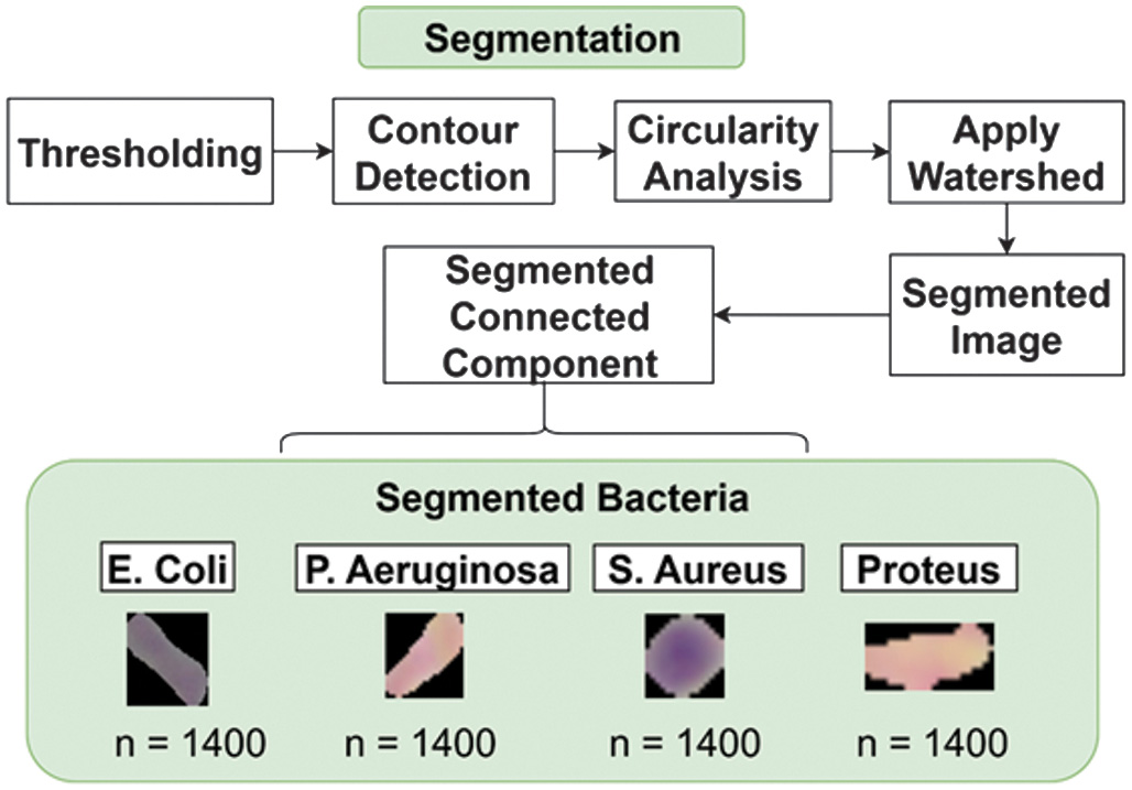 This metric determines how closely the shape of a contour approximates a circle. Contours with circularity values greater than 0.6 and an area larger than 500 pixels are classified as round-shaped bacteria. These contours are then drawn onto the output image as part of the round bacteria mask. For the detection of rod-shaped bacteria, an initial mask was generated from the binary threshold result. This mask was further refined using morphological dilation with a kernel size of 11 × 11. Dilation serves to emphasize the separation between foreground (bacteria) and background regions by expanding the bright areas. Following this, the watershed algorithm was applied to further distinguish between bacterial and non-bacterial regions. Marker-based segmentation was employed to label the foreground (bacteria), background, and unknown regions. The watershed method then accurately segmented rod-shaped bacteria by marking object boundaries more distinctly. The final mask was produced by combining the watershed result with the previously obtained mask using bitwise operations, effectively isolating rod-shaped bacteria while suppressing background interference. As a result, the segmentation output distinctly separates both rod-shaped and round-shaped bacteria, making the image ready for subsequent feature extraction. This segmentation approach enables precise bacterial shape isolation, minimizes background noise, and sharpens the focus on key bacterial regions within the image, thus enhancing the accuracy of the analysis in the later stages.
