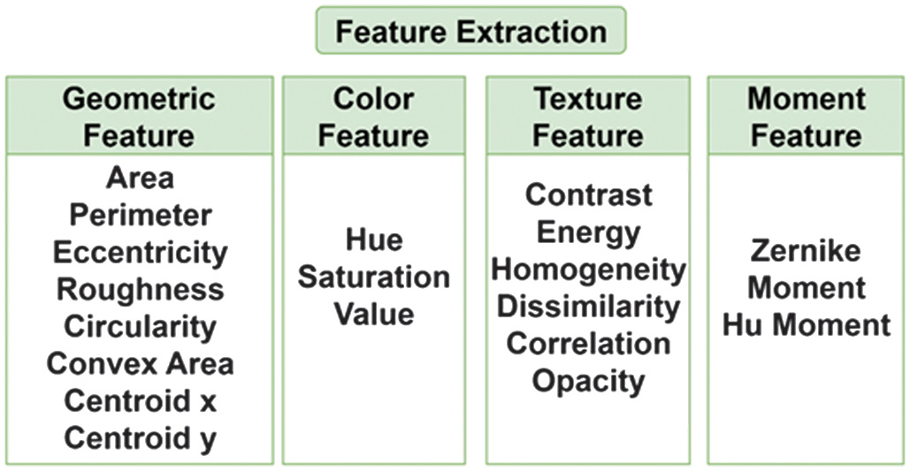 The feature extraction stage aims to obtain important attributes from the segmented bacteria. These attributes include geometric, texture, color, and moment information of the image, which will be used for the next feature selection and detection process. Figure 7 shows the features used.
