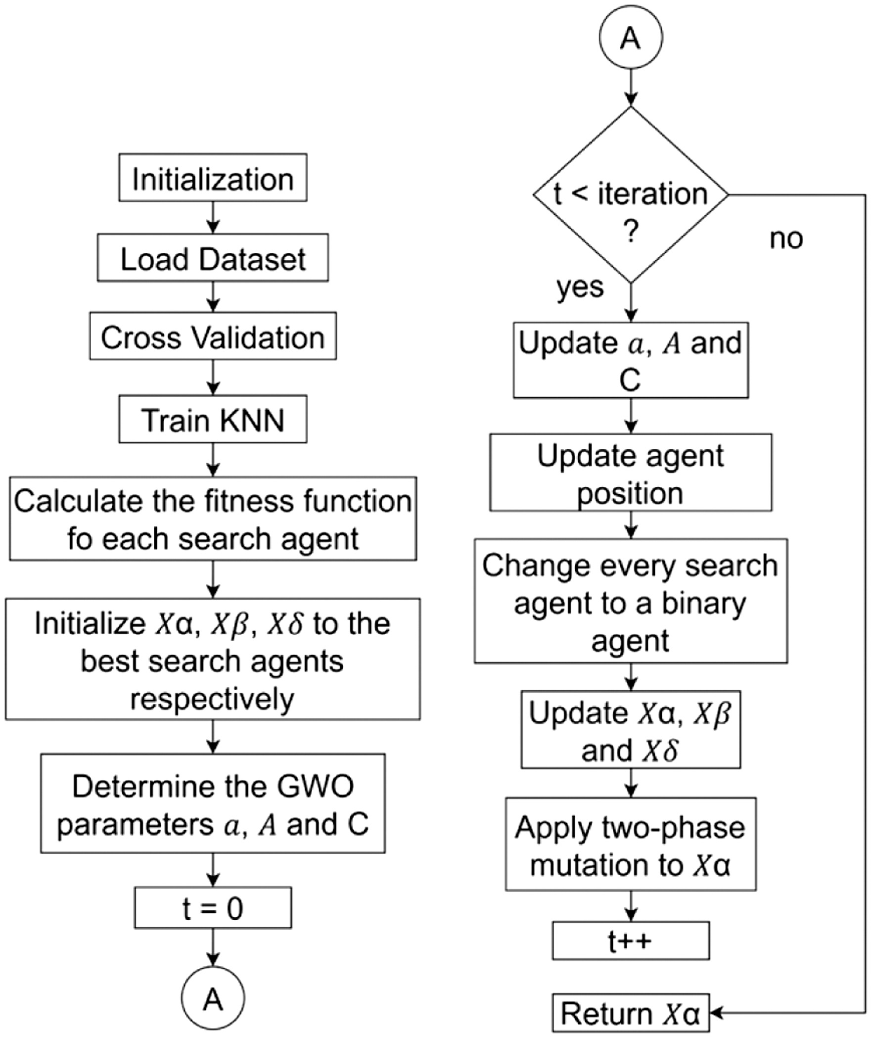 TMGWO introduces a two-phase mutation mechanism into the standard GWO framework. In the first phase, irrelevant features are removed from the candidate feature subset, thereby eliminating noise and reducing redundancy. In the second phase, potentially valuable features that were previously unselected are reconsidered and added back if they contribute positively to the model’s performance [28,29]. This two-phase process ensures that the final feature subset maximizes classification accuracy. The GWO algorithm models the leadership hierarchy and hunting strategies of gray wolves. The population is split into four groups, each representing a different level of dominance: Alpha (α), Beta (β), Delta (δ), and Omega (ω). The alpha wolf signifies the best solution identified to date, and the beta and delta wolves represent the second- and third-best solutions, respectively [30]. The remaining wolves are classified as omega wolves, which follow the guidance of the top three leaders [31,32]. During the optimization process, wolves update their positions relative to the prey, mathematically imitating encircling, hunting, and attacking behaviors. The prey’s position denotes the optimal solution, and the wolves iteratively adjust their locations to converge toward it [33]. During hunting, the wolves are able to encircle their prey [34], which can be mathematically expressed as: