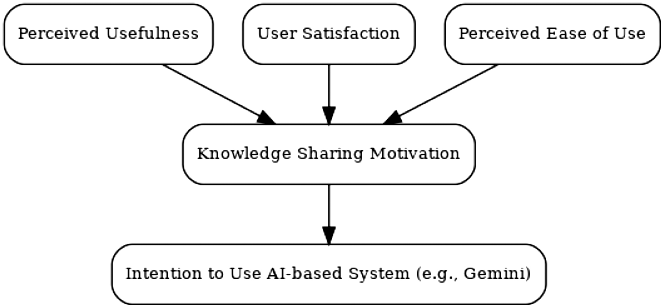 Patel et al. [22] further argue that a satisfying user experience fosters trust and loyalty, encouraging users to participate in knowledge-sharing activities. For Gemini, high levels of satisfaction are associated with features i.e., ease of access, reliability, and the platform’s capability to provide accurate and relevant information. These factors not only enhance users’ motivation to share knowledge but also strengthen their intention to continue using the platform. Based on these considerations, we hypothesize: