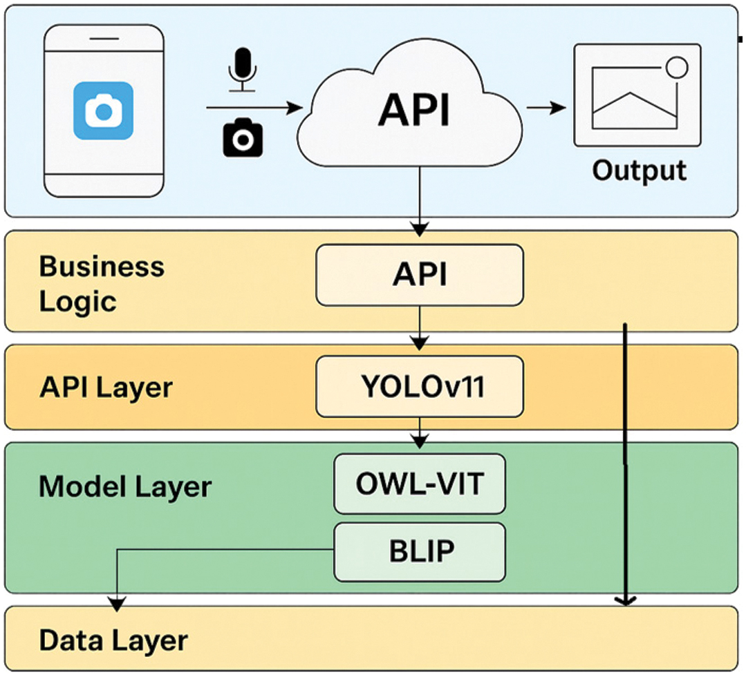 At the backend, the system relies on a cloud-hosted service layer where the core AI models are deployed. This includes YOLOv11 for object detection, OWL-ViT for open-vocabulary recognition, and BLIP for descriptive scene summarization. Together, these models provide complementary functionality—YOLOv11 offers high-speed recognition of trained categories, BLIP synthesizes image descriptions in natural language, and OWL-ViT enables zero-shot recognition of user-defined objects via textual queries.