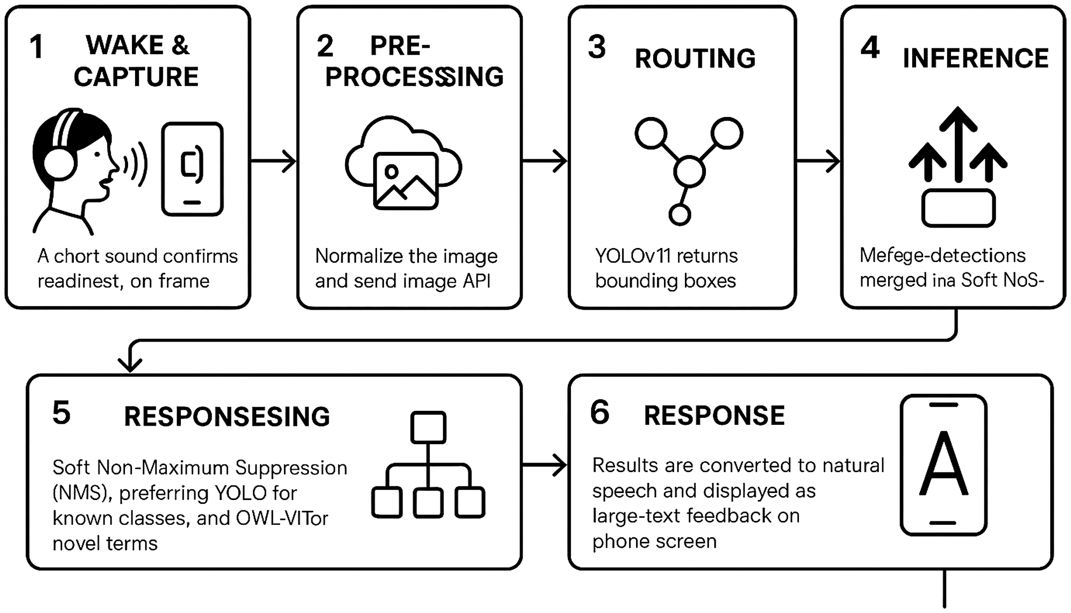 - 6.Response—Results are converted to natural speech and displayed as large-text feedback on the phone screen.