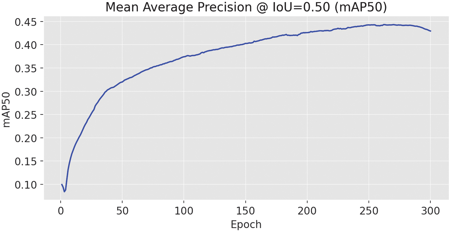 This trend is illustrated in Fig. 21, which shows a steady increase in mAP@0.5 throughout training, peaking at epoch 132 before exhibiting signs of performance decline due to overfitting. The corresponding mAP@0.5–0.95 curve, shown in Fig. 22, plateaued at 0.451, reflecting the model’s effectiveness across stricter IoU thresholds. Together, these values confirm improved detection precision over the medium variant but also highlight the model’s limitations in consistently detecting smaller or ambiguous objects.