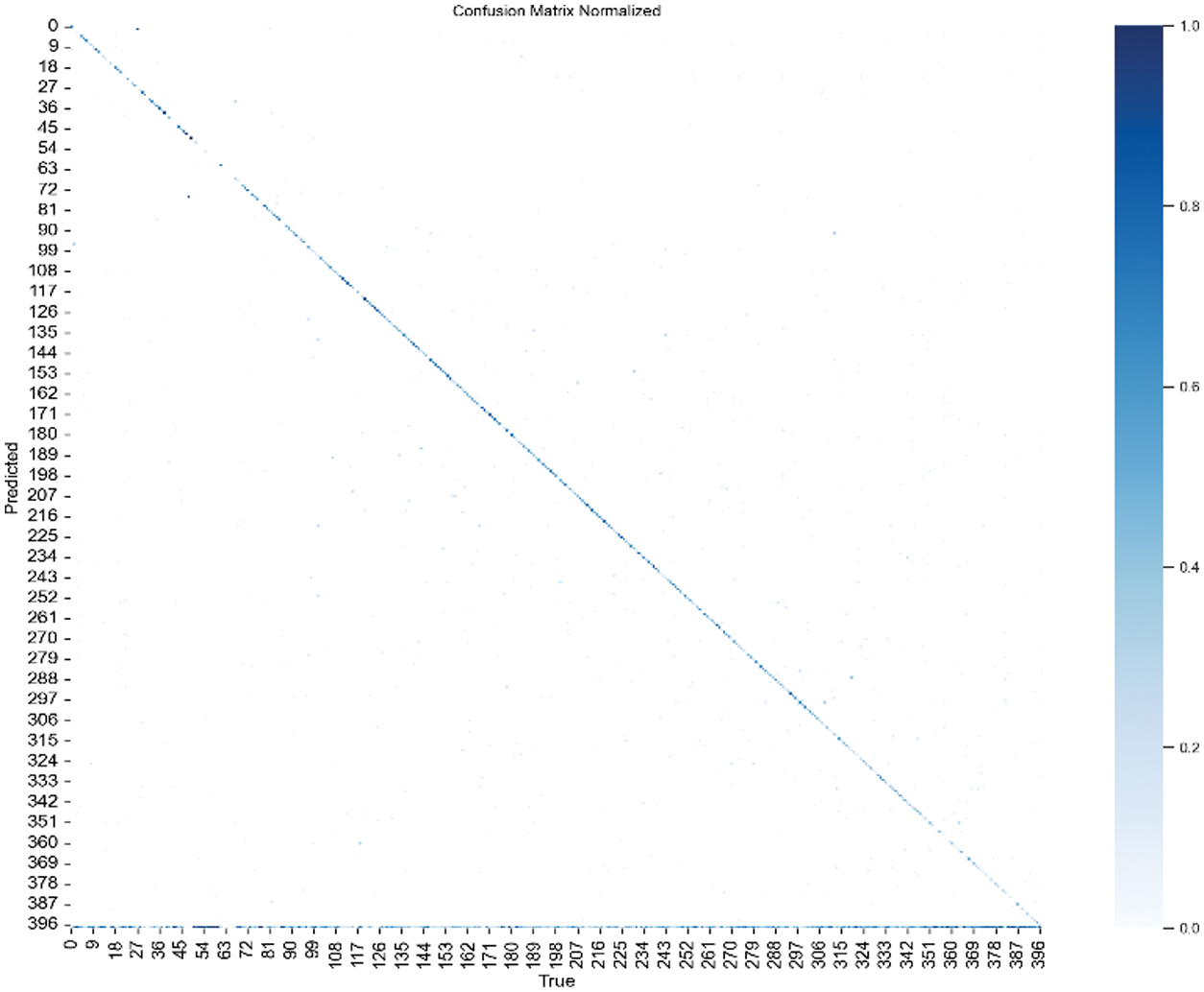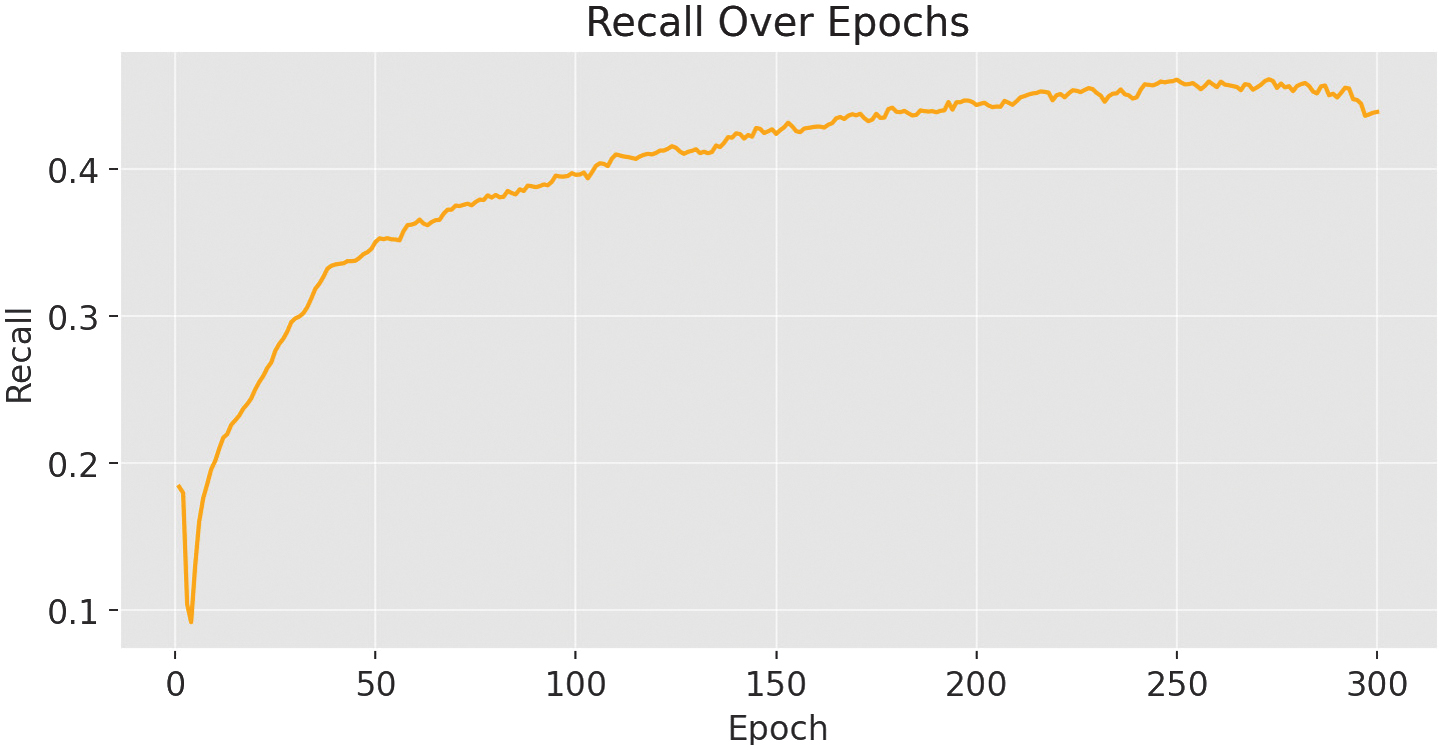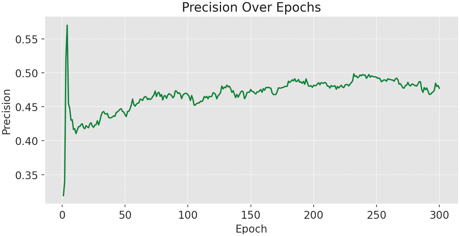 Precision reached 0.489 (see Fig. 8) and recall 0.457, leading to an F1 score of 0.43 at epoch 263.
