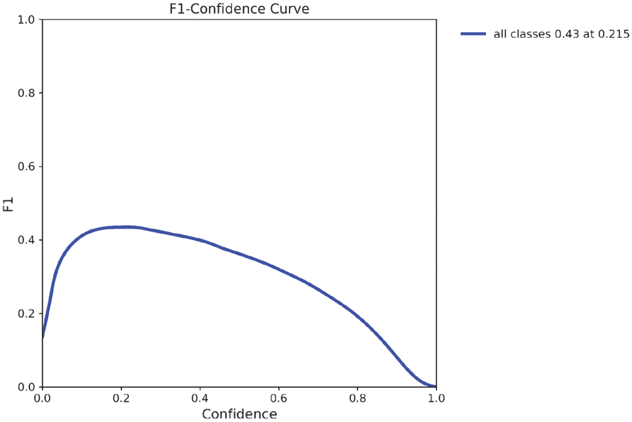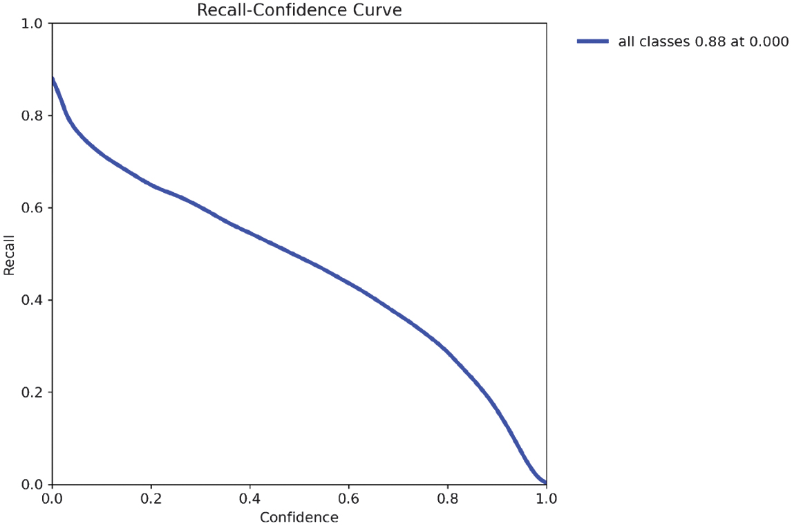 The recall results are shown in Fig. 9, while the F1-confidence curve (Fig. 10) highlights the optimal confidence threshold where the trade-off between precision and recall is maximized. As illustrated in the precision–confidence curve (Fig. 11), precision steadily improves with higher confidence thresholds, reaching 1.0 at the cost of recall. The recall–confidence curve (Fig. 13) shows the opposite effect: high recall at low thresholds, but a steep decline as the threshold rises. At a confidence of 0.215, the model achieves its highest F1 score of 0.43, making it the ideal operational point for minimizing misclassification risk while maintaining reliable detections.