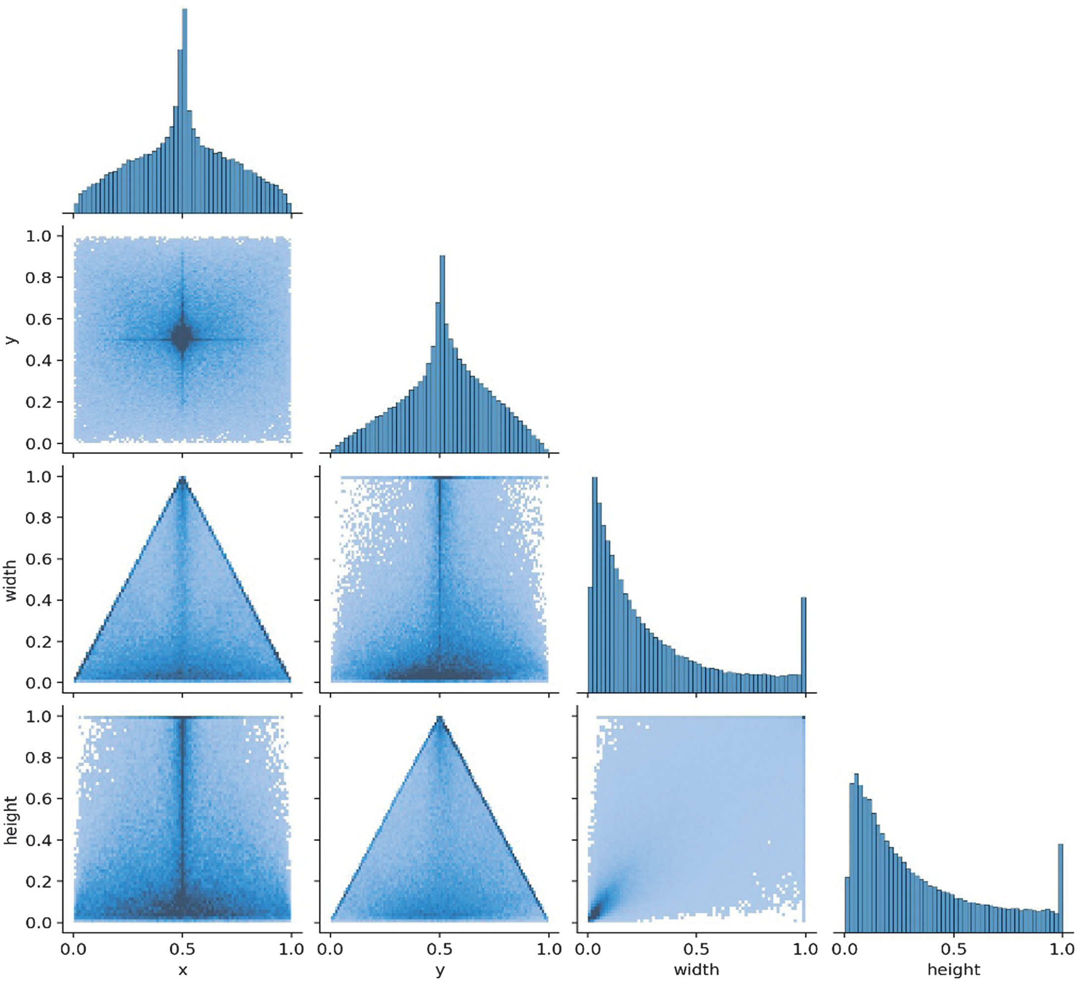 While (x, width) and (y, height) show a triangle distribution indicating a dependency, objects near the center tend to have larger bounding boxes, for example, when width decreases, and x moves away from the center. The model might expect bigger objects in the center and struggle with detecting smaller objects.