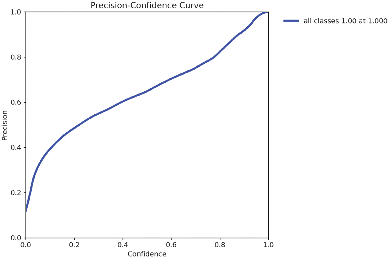 As illustrated in the precision–confidence curve (Fig. 11), model precision improves steadily as the confidence threshold increases. While precision reaches 1.0 at high thresholds, this comes at the cost of recall, suggesting fewer detections are made. This supports the need to balance threshold selection carefully depending on the application’s tolerance for false negatives.