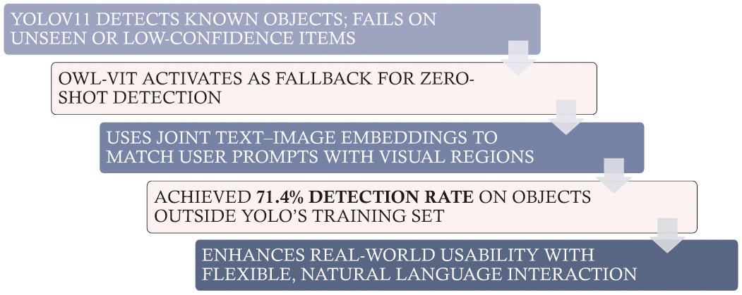 Integrating OWL-ViT introduced open-vocabulary capability, a methodological expansion beyond fixed-class detection, strengthening the system’s adaptability.