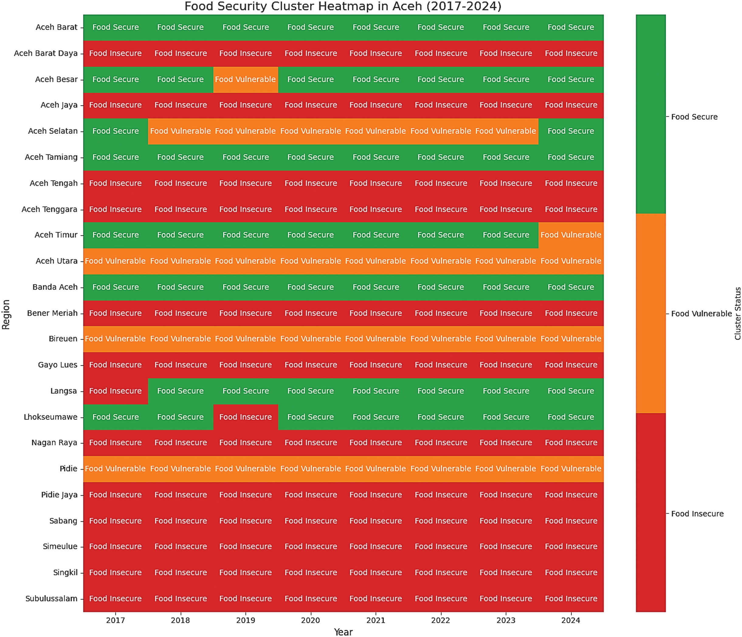 Despite these contributions, most existing studies remain concentrated on broader regions or specific commodities, leaving significant gaps at the subnational level. In particular, research addressing localized food system challenges in Aceh, Indonesia, is virtually absent. The unique socioeconomic characteristics, agricultural diversity, and regional vulnerabilities in Aceh necessitate a tailored approach that integrates both forecasting and classification within a unified framework.