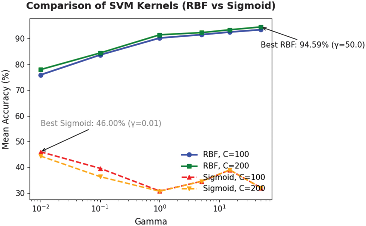 SVM with RBF kernel showed strong sensitivity to C and γ, with accuracies below 85% at low γ (0.01–0.1) and improving above 90% for C = 100–200. The best accuracy of 94.59% occurred at C = 200 and γ = 50. SVM with sigmoid kernel was also evaluated across C and γ to assess its handling of nonlinear separability. In Table XIV, the SVM with a sigmoid kernel was evaluated across varying C and γ values to assess its capability in modeling nonlinear separability within the dataset.