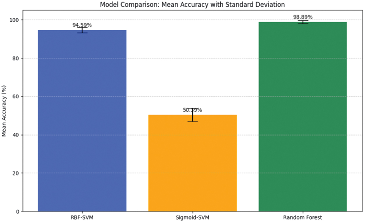 As shown in Fig. 9, RF outperformed SVM, achieving 98.89% mean accuracy, low variability (std. dev = 0.75%), and high F1-scores (0.985–0.995), making it the more robust and reliable model.