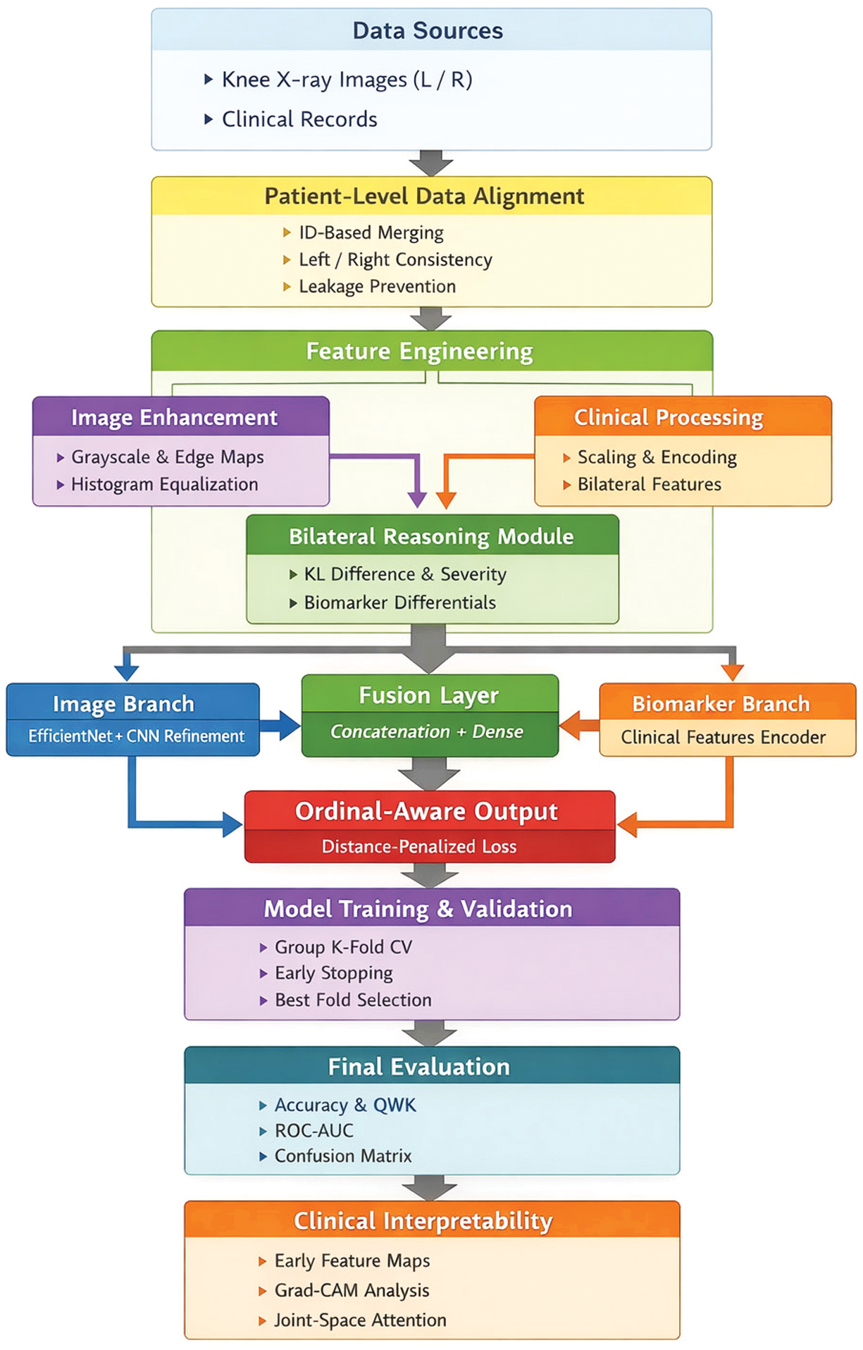 We proposed a KOMMCF: an innovative classification strategy that integrated clinical parameters, biomarker profiles, and X-ray imaging to enhance KOA diagnosis, alongside a modified KL grading scheme that merges grades 1 & 2 and 3 & 4 for streamlined classification. The framework preprocessed X-ray images via grayscale, sharpening, and Contrast Limited Adaptive Histogram Equalization (CLAHE)-based contrast enhancement, histogram equalization, and Canny edge detection to capture the outlines and bone contours that are key indicators of osteoarthritis progression. CNNs extracted features via convolution layers with ReLU activation, feature reduction via global average pooling, and a fully connected dense layer. Multi-layer perceptron (MLPs) extracted clinical data features via transforming input data through dense layers with ReLU activation.