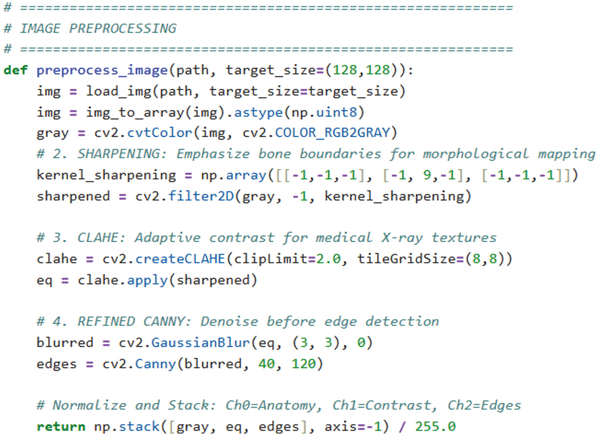 Library: TensorFlow/Keras, NumPy & Pandas, OpenCV (cv2): Used for image processing (e.g., grayscale conversion, histogram equalization, edge detection), Scikit-learn: Provides utilities for label encoding, scaling, and computing class weights, Matplotlib: Used for visualization.