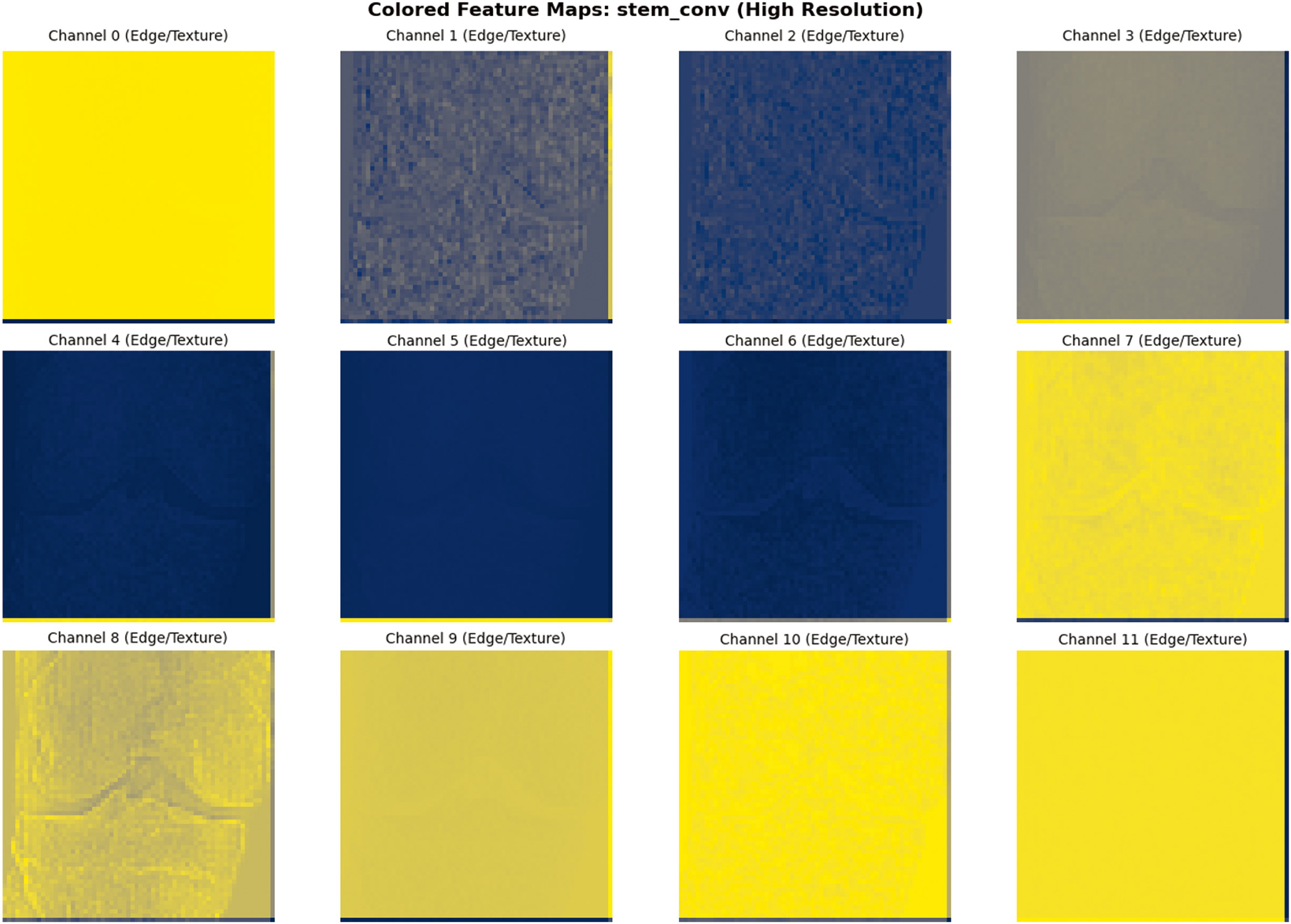 To enhance transparency and to gain trust in the models, we also applied Grad-CAM to high spot the most relevant regions in X-ray images that led the model to make its prediction, which is crucial to clinical validation as it confirms that the model is relying on anatomical features of importance and not noise or irrelevant artifacts. Grad-CAM visualizations highlighting clinically relevant regions influencing KOMMCF predictions across different OA severity levels are presented in Fig. 7.
