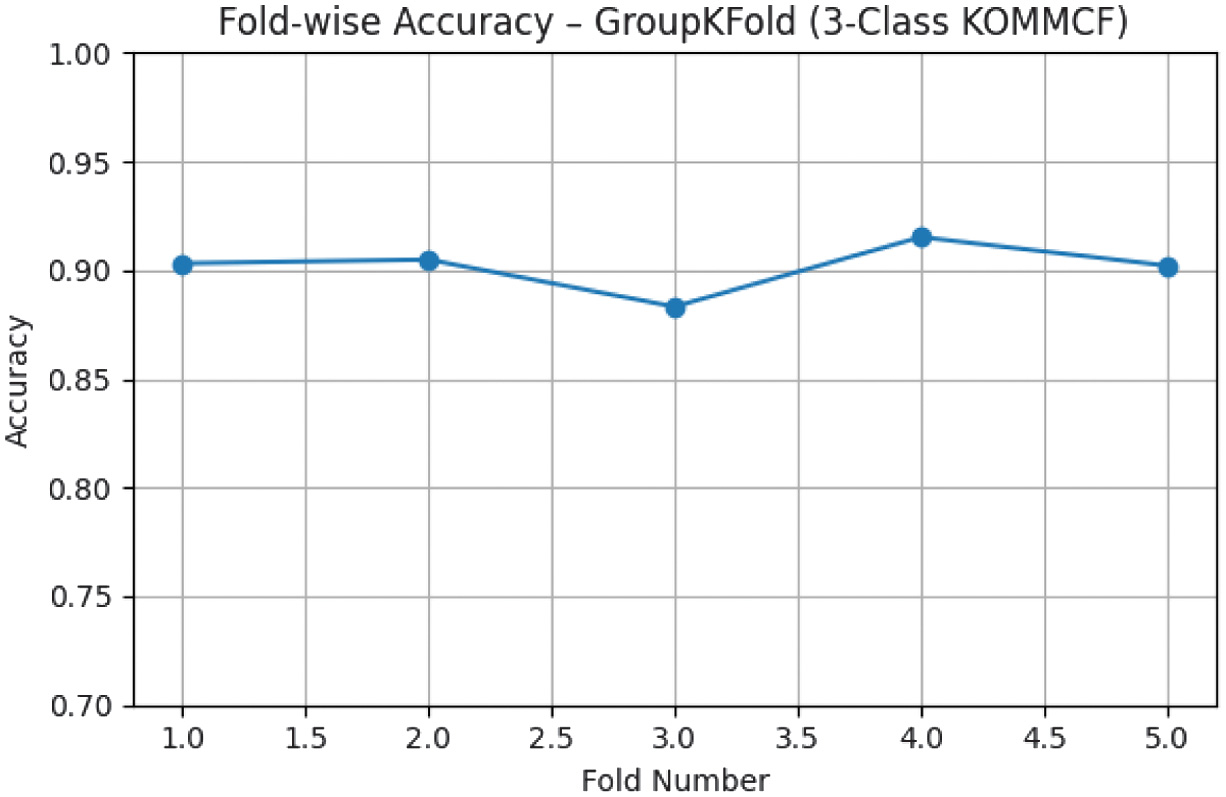 Fig. 6. Fold-wise accuracy – Group K-Fold (3-Class KOMMCF Model).