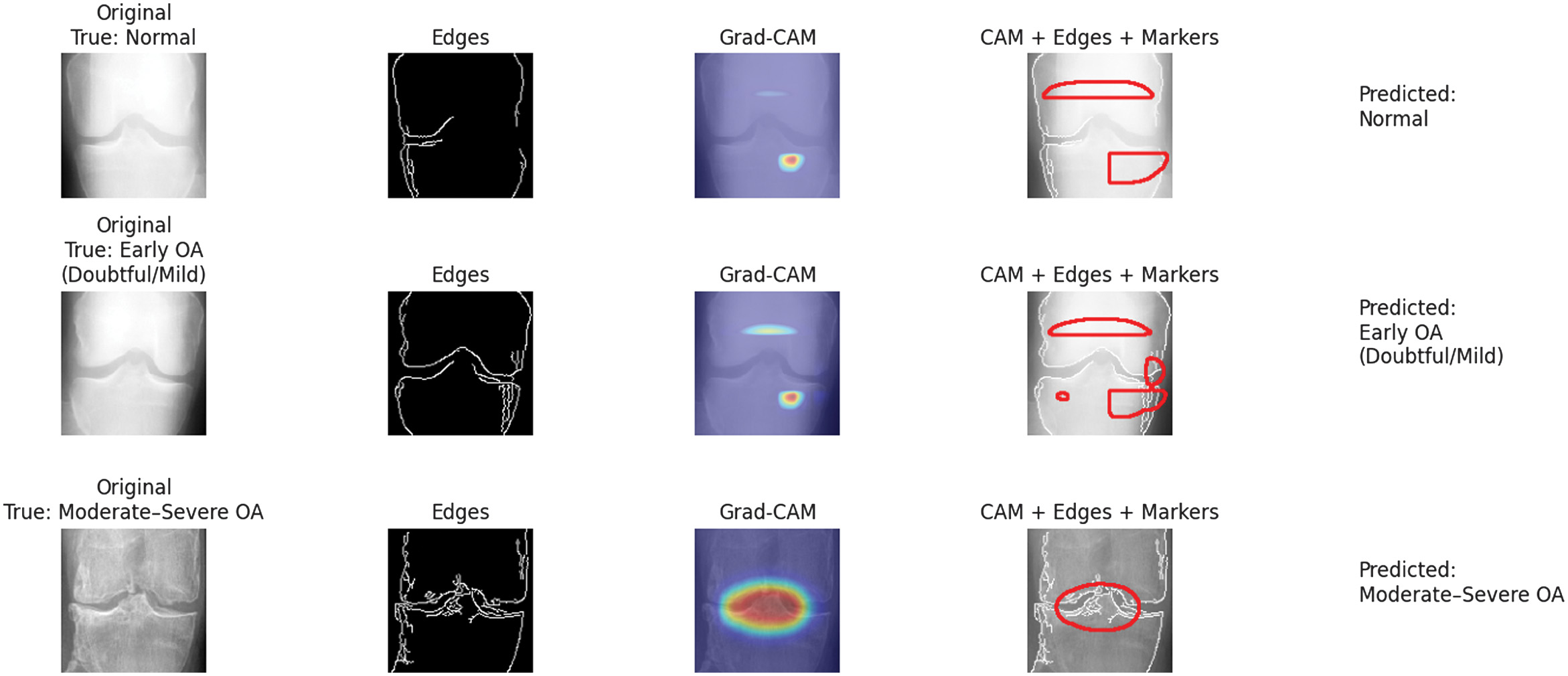 Fig. 7. Grad-CAM visualization highlighting regions influencing KOMMCF predictions for Normal, Early OA, and moderate–severe knee osteoarthritis cases.