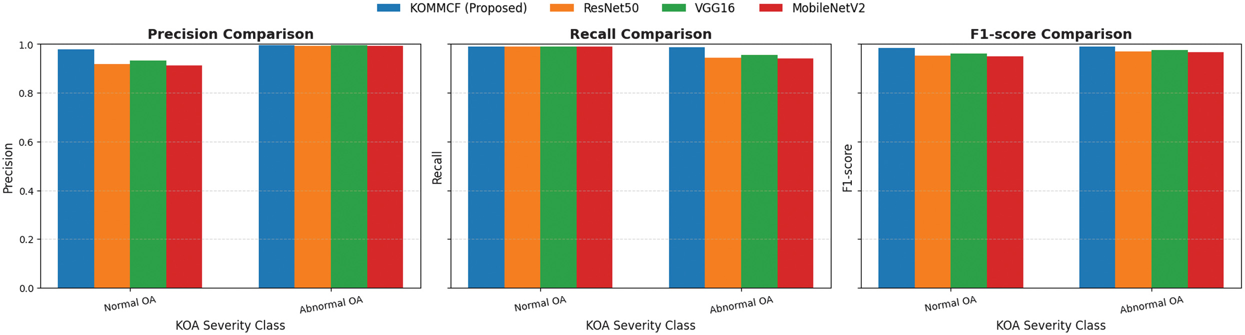 Fig. 8. Comparative analysis of precision, recall, and F1-score for different models (ResNet50, VGG16, MobileNetV2, and Custom CNN) across three KOA (Knee Osteoarthritis) classification categories: Normal and abnormal.