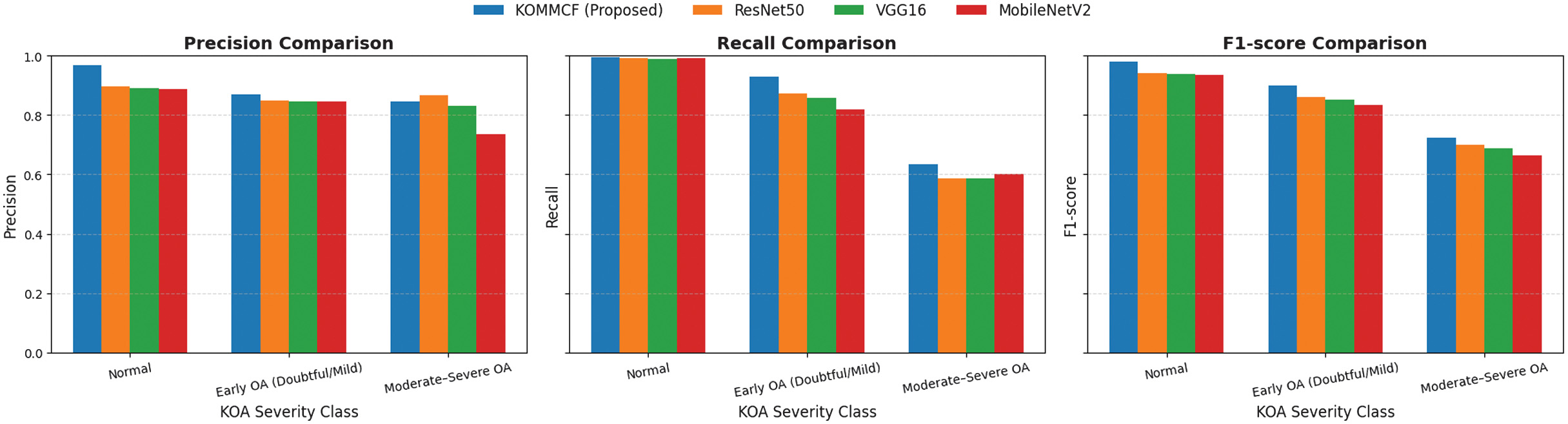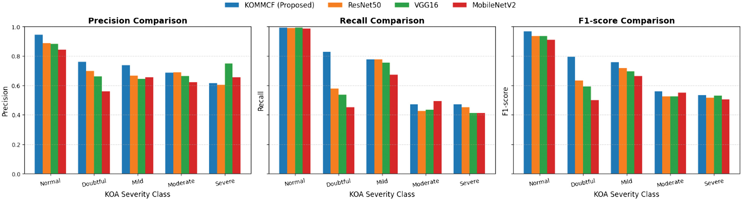 Fig. 9. Comparative analysis of precision, recall, and F1-score for different models (ResNet50, VGG16, MobileNetV2, and Custom CNN) across three KOA (Knee Osteoarthritis) classification categories: Normal, doubtful/mild, and moderate/severe.