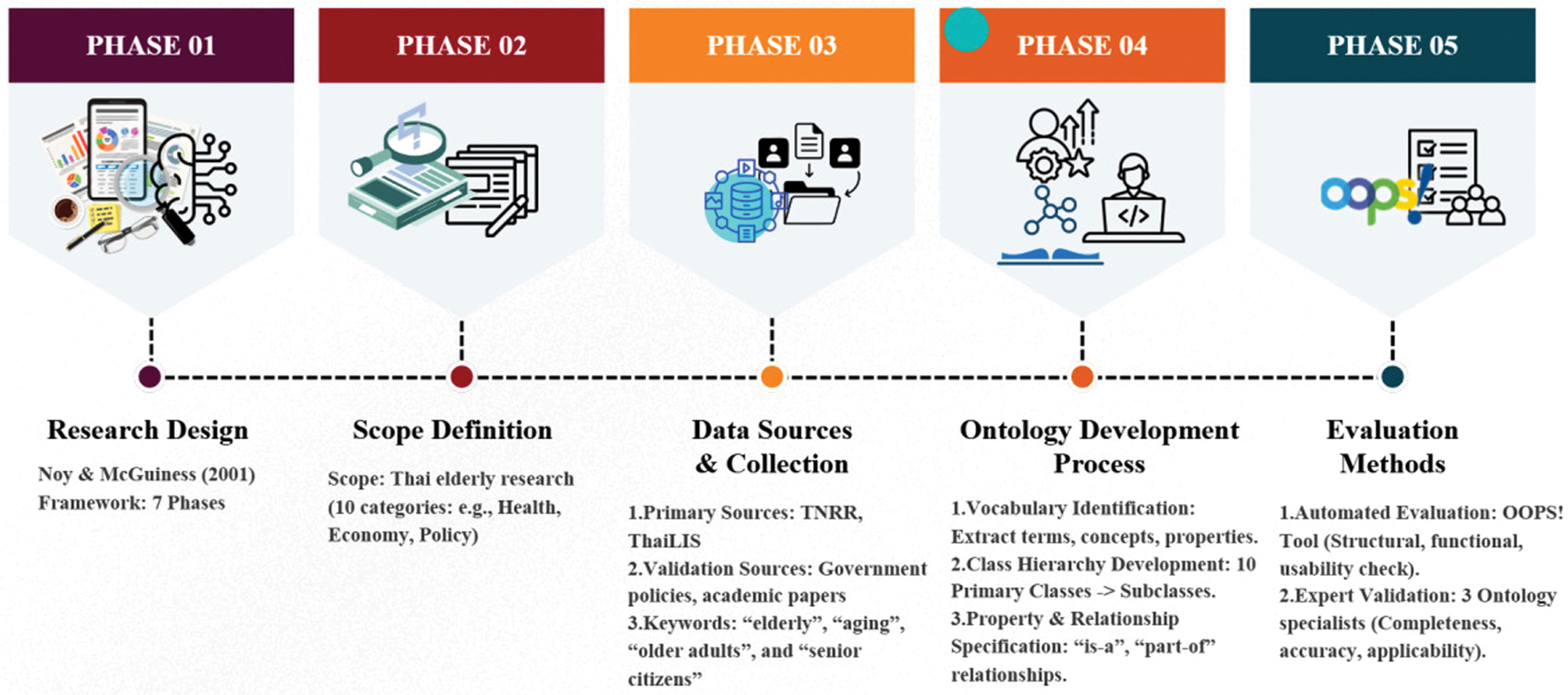 This research employed a systematic ontology development approach grounded in established ontology engineering methodologies, primarily following the framework proposed by [11], with contextual adaptations to reflect the characteristics of elderly research in Thailand. The development process consisted of seven main phases: scope determination, ontology reuse evaluation, vocabulary identification, class hierarchy definition, property specification, constraint establishment, and evaluation. Rather than aiming to demonstrate empirical system performance, the research design focused on ensuring methodological transparency, conceptual coherence, and structural validity appropriate for foundational ontology development.