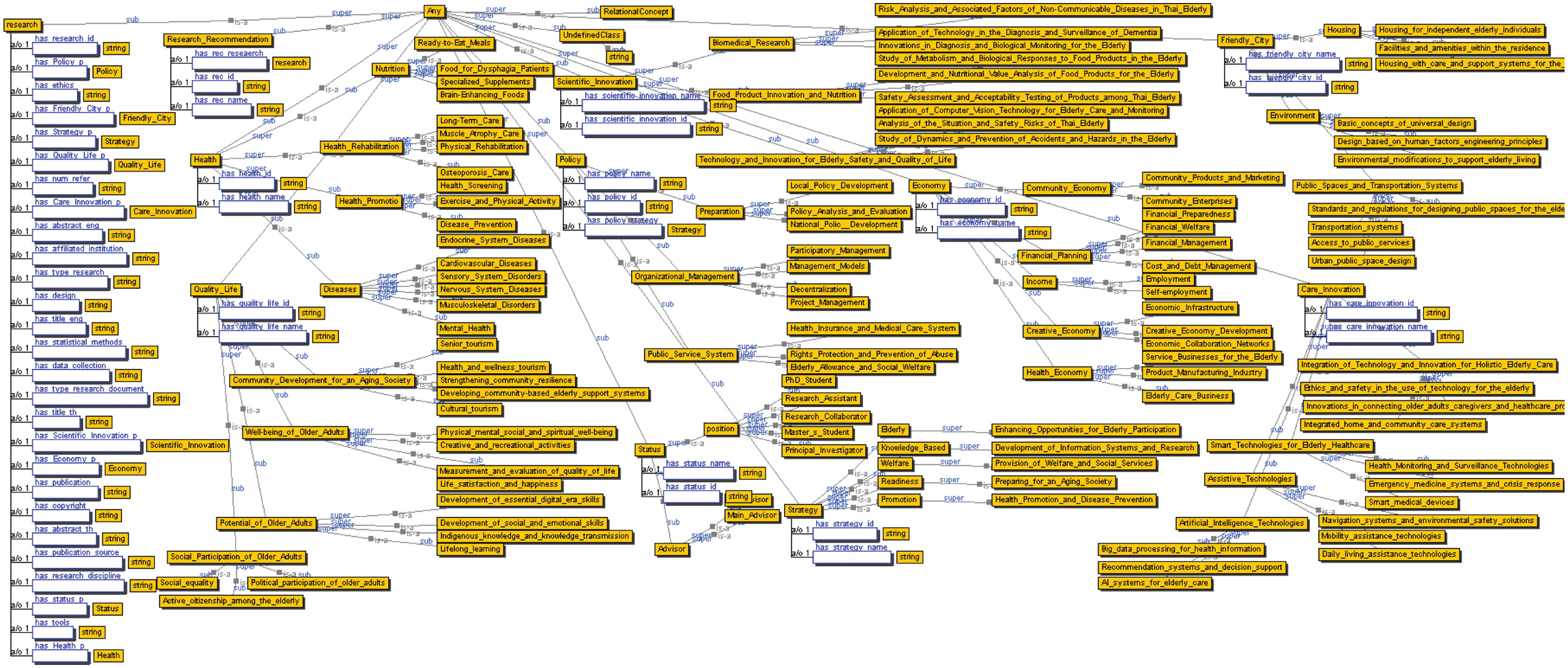 The ontology comprises 10 top-level classes that represent the principal domains of aging research in Thailand. These classes are designed to be comprehensive and to reflect the current research landscape. The 10 top-level classes are (1) research, (2) strategies, (3) researcher status, (4) policy, (5) economy, (6) health, (7) quality of life, (8) age-friendly cities, (9) care innovations, and (10) scientific innovations. From these, 27 subclasses are defined: (1) preparation; (2) organizational management; (3) public service systems; (4) financial planning; (5) income; (6) community economy; (7) health economics; (8) creative economy; (9) health promotion; (10) nutrition; (11) diseases; (12) rehabilitation; (13) potential of older adults; (14) community development for an aging society; (15) social participation of older adults; (16) environment; (17) housing; (18) public spaces and transportation systems; (19) smart technologies for healthcare for older adults; (20) assistive technologies; (21) artificial intelligence technologies; (22) integration of technology and innovation for holistic care of older adults; (23) biomedical research; (24) innovation in food products and nutrition; (25) technology and innovation for older adults’ safety and quality of life; (26) researcher position; and (27) advisor. The hierarchical organization and inter-class relationships are detailed in Fig. 3 and Table I.