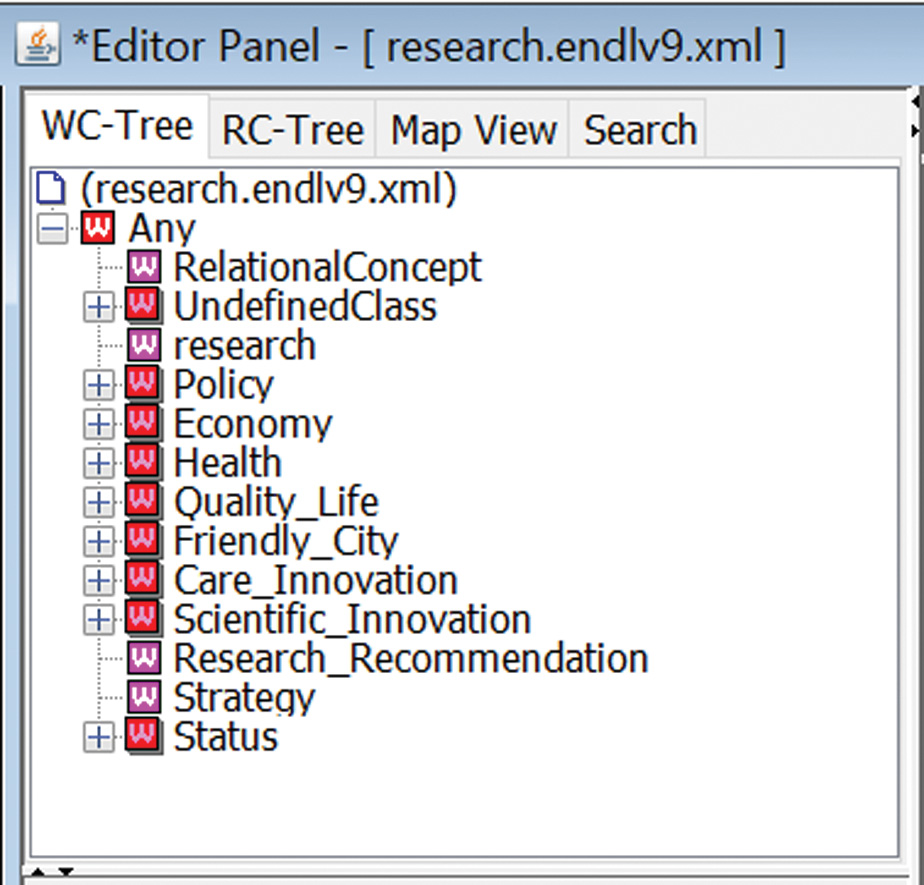 The ontology was conceptually designed to provide a semantic foundation that may support the development of ontology-driven applications in future work. Specifically, the framework organizes knowledge across 10 key information categories: research work, strategy, researcher status, policy, economy, health, quality of life, age-friendly cities, care innovation, and scientific innovation. These categories were identified through thematic analysis of national research priorities and recurring conceptual patterns in aging-related studies, rather than being predefined application requirements.