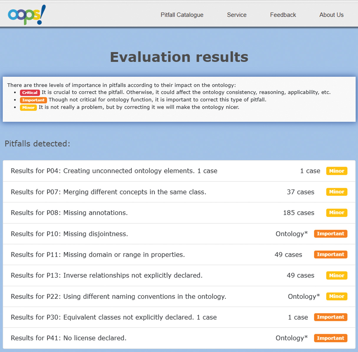 The ontology was evaluated using two complementary evaluation approaches: automated assessment using the OntologyPitfall Scanner (OOPS!) and expert-based validation conducted by three domain specialists with expertise in ontology engineering and aging-related research. The OOPS! tool was employed to identify common structural, semantic, and modeling pitfalls, thereby supporting technical quality assurance rather than empirical validation.