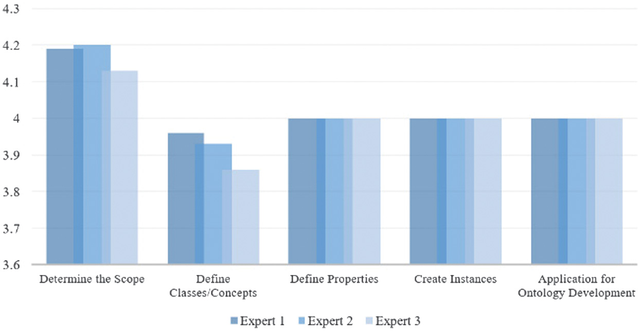 Expert evaluation was conducted using structured questionnaires covering five evaluation dimensions, including scope adequacy, conceptual clarity, structural consistency, applicability, and reuse potential. Given the limited number of experts, the evaluation was interpreted as qualitative domain validation, consistent with common practices in ontology development studies.