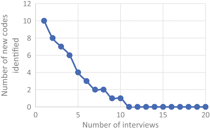 Thematic saturation was monitored continuously throughout the analysis of faculty interviews on affective barriers to AI adoption in higher education. Each interview was transcribed and coded immediately, and a saturation tracking table was used to record the emergence of new codes related to emotional, psychological, and attitudinal barriers toward AI. During the first 12 interviews, core themes—such as anxiety about AI replacing pedagogical roles, lack of confidence in using AI tools, fear of losing academic integrity, and uncertainty about institutional expectations—were identified. After interview 13, no new themes emerged, indicating that theme saturation had been reached. The remaining interviews (14–20) provided additional depth, nuance, and variation within the established affective barriers, contributing to meaning saturation (Fig. 1). This approach follows the recommendations of [30,31] who distinguish between theme saturation (no new themes) and meaning saturation (full understanding of theme complexity). Therefore, the final sample of 20 interviews was judged sufficient to capture both the breadth and depth of faculty affective barriers to adopting AI in higher education.
