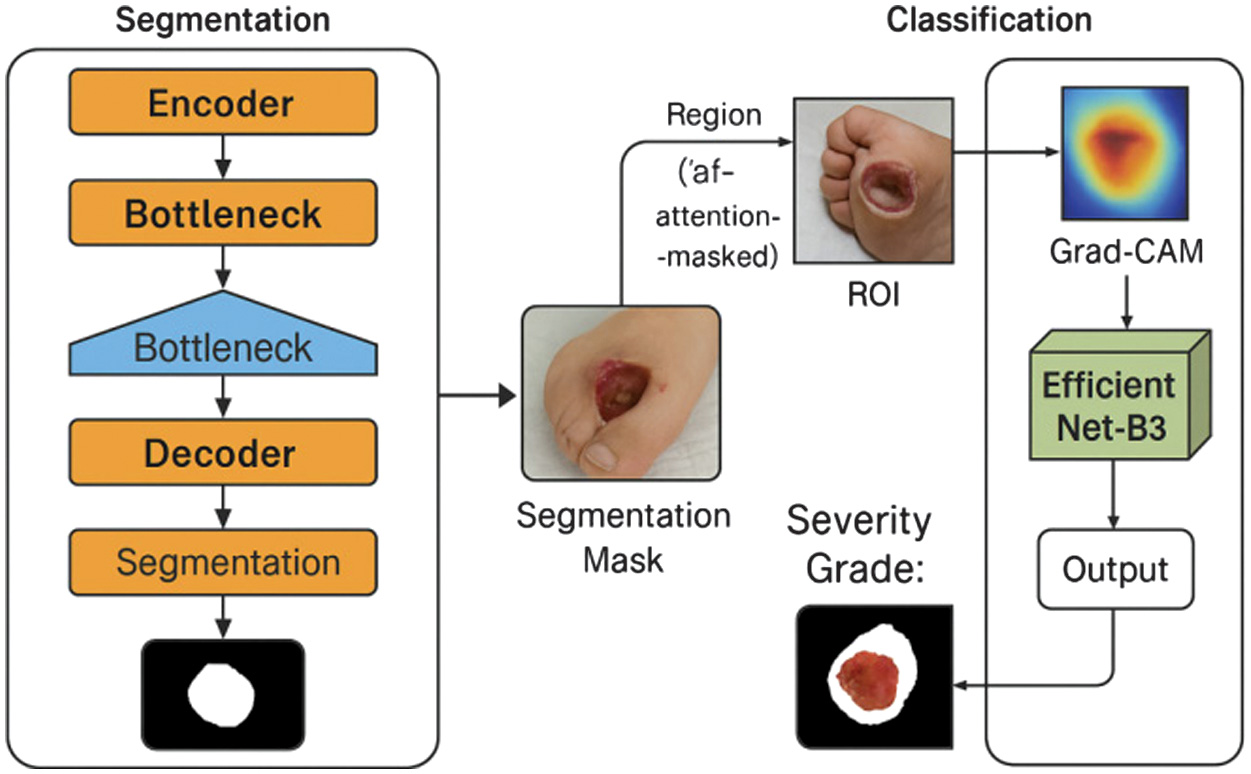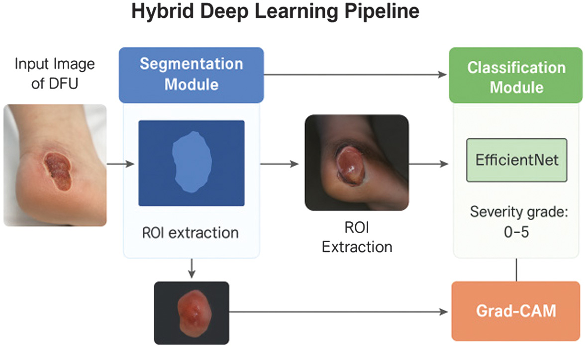 This study developed a hybrid deep learning framework that combines segmentation, ordinal-aware classification, and visual interpretability for automated DFU assessment. The two-stage design U-Net-based segmentation followed by EfficientNet-B3 classification with Grad-CAM visualization demonstrated that region-focused modeling yielded higher accuracy and transparency than single-stage CNNs.