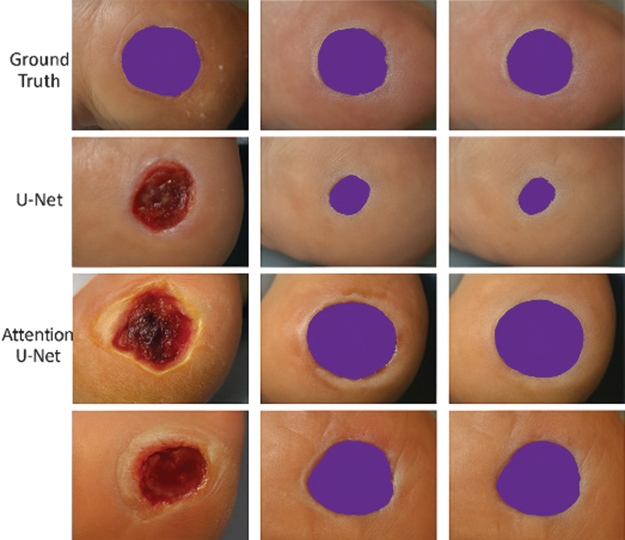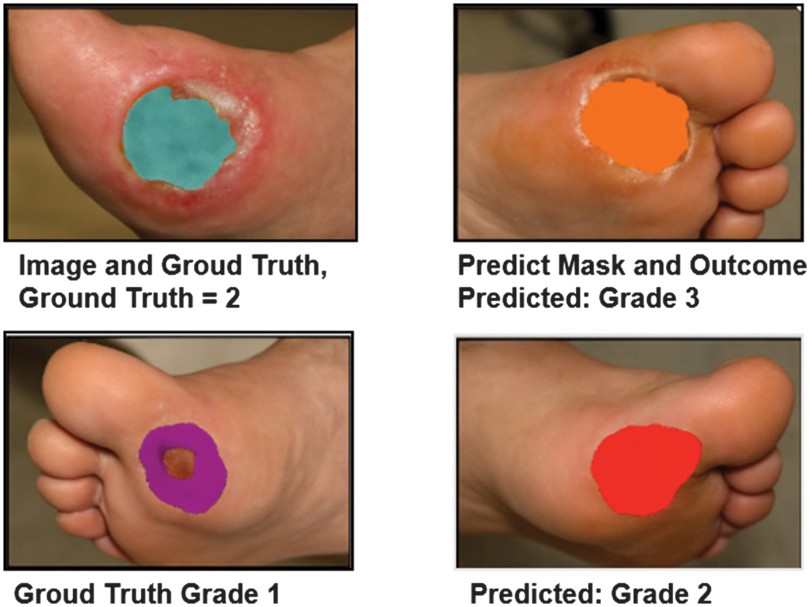 The first stage automatically isolates the ulcer region from surrounding tissue, which is essential for suppressing background interference and improving downstream classification accuracy. As shown in Fig. 2, the segmentation network successfully separates the lesion area across wounds of varying color, size, and illumination.