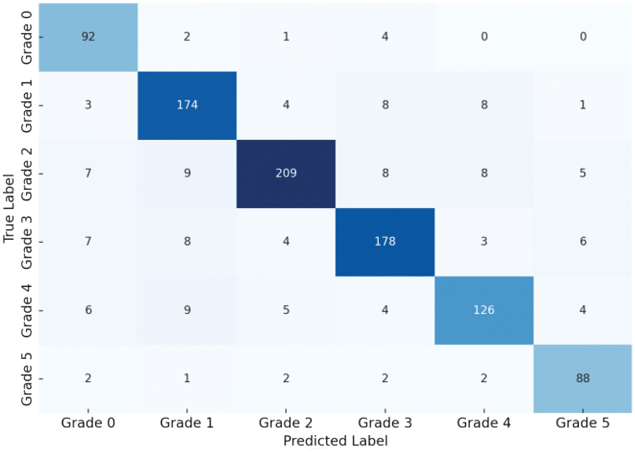 Rows represent the ground-truth severity grades (0–5), while columns indicate the predicted grades. The strong concentration of values along the diagonal indicates high classification accuracy, whereas the majority of misclassifications occur between adjacent grades (e.g., 2 ↔ 3 and 3 ↔ 4), demonstrating ordinal consistency and validating the effectiveness of the CORAL loss.