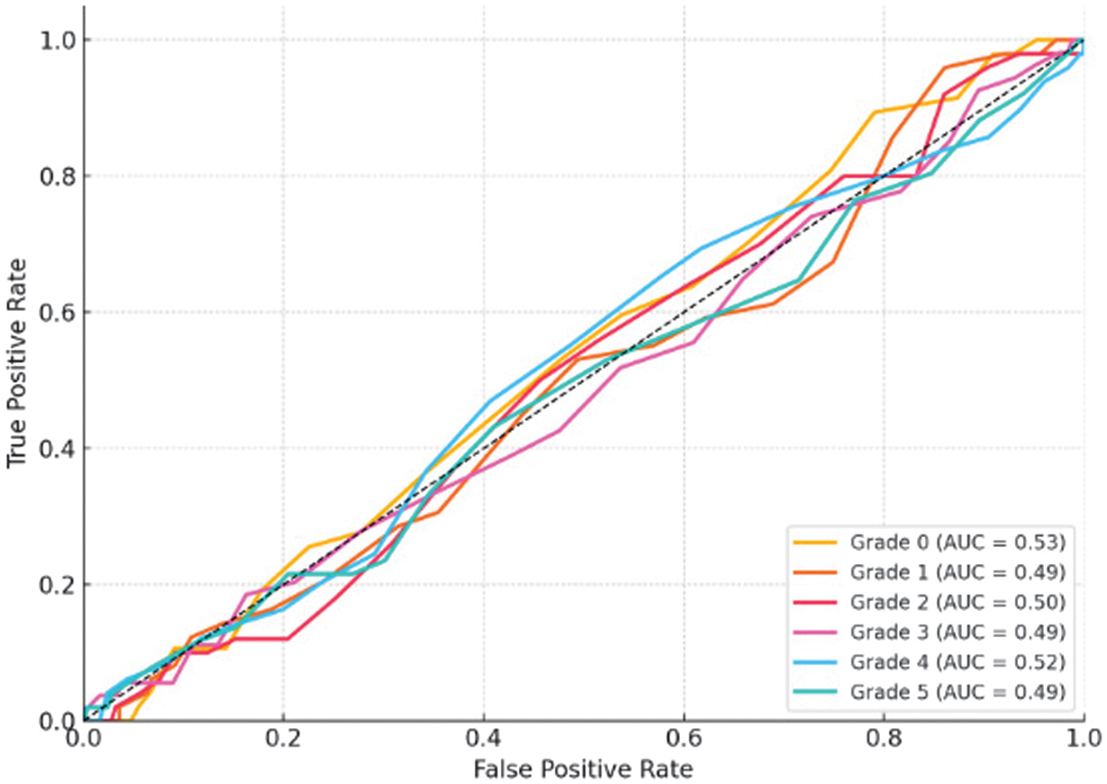 The high AUC values indicate that the model captures discriminative features effectively across varying ulcer morphologies. The ROC pattern also confirms that mid-grades (2–4) exhibit slightly lower separability than extreme grades (0 or 5), reflecting natural overlap in clinical presentation.