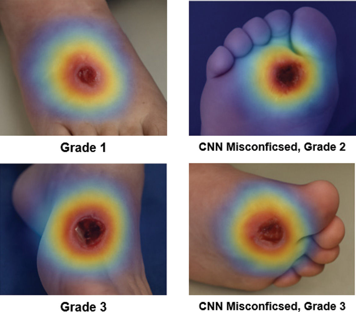 Misclassified cases revealed broader or misplaced attention zones. For instance, some shallow Grade 2 ulcers were predicted as Grade 3 due to model activation on peripheral callused tissue rather than the ulcer core [31]. These findings highlight the dual role of Grad-CAM: identifying algorithmic bias and guiding dataset improvement.