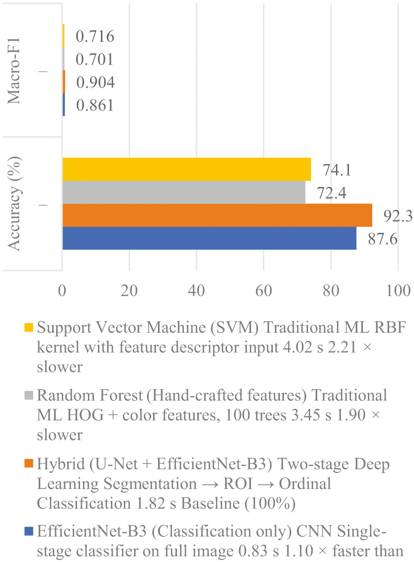 Compared with traditional machine learning methods, including Random Forest (3.45 s) and Support Vector Machine (4.02 s), the hybrid framework provides a substantially improved balance between accuracy and computational efficiency. A detailed comparison of inference times across different models is presented in Table I. Although the hybrid approach is marginally slower than a single-stage CNN (0.83 s), the additional inference time is justified by the model’s enhanced interpretability, ordinal-aware severity grading, and overall diagnostic reliability.